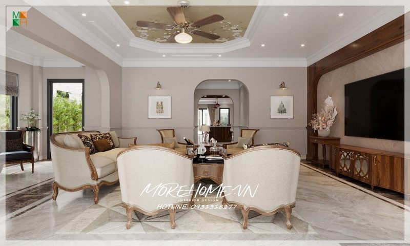 Sofa phòng khách với đường cong tân cổ điển đã tạo nên một ấn tượng rất lớn với sự kết hợp giữa tông màu nâu và màu trắng chủ đạo đã tạo nên một không gian sống nổi bật cho căn phòng.